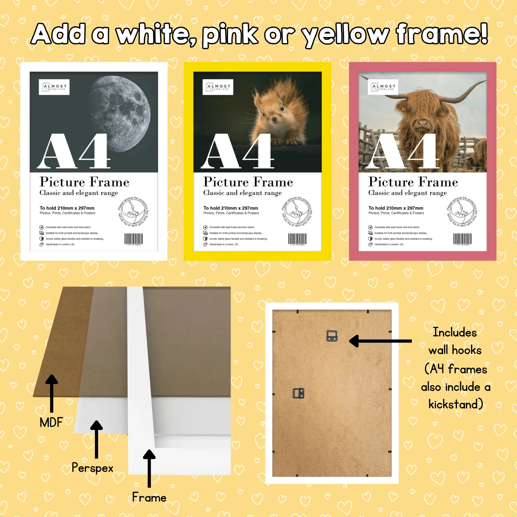 Each lightweight frames come with versatile wall hooks, allowing for easy hanging in both portrait and landscape orientations (A4 frames also come with a kickstand). Our frames are made from a from durable recycled compound called Polecore, and are equipped with a high-clarity shatterproof perspex sheet, providing protection and clarity.